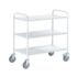 Chariot de bureau avec 3 étagères, capacité de charge : 150 kg, poids propre : 27 kg, roue ø : 12,5 cm, surface de chargement (L/L) : 78/50 cm, hauteur de la surface de chargement ou du plateau : 23, 51 et 80 cm, 2 roues pivotantes et 2 roues fixes avec freins sur les roues pivotantes, pneus TPE bleu-gris, cadre en acier profilé en tube d'acier, surface de chargement en panneau de particules (MDF) avec décor blanc, bords thermolaqués, couleur : gris clair RAL 7035