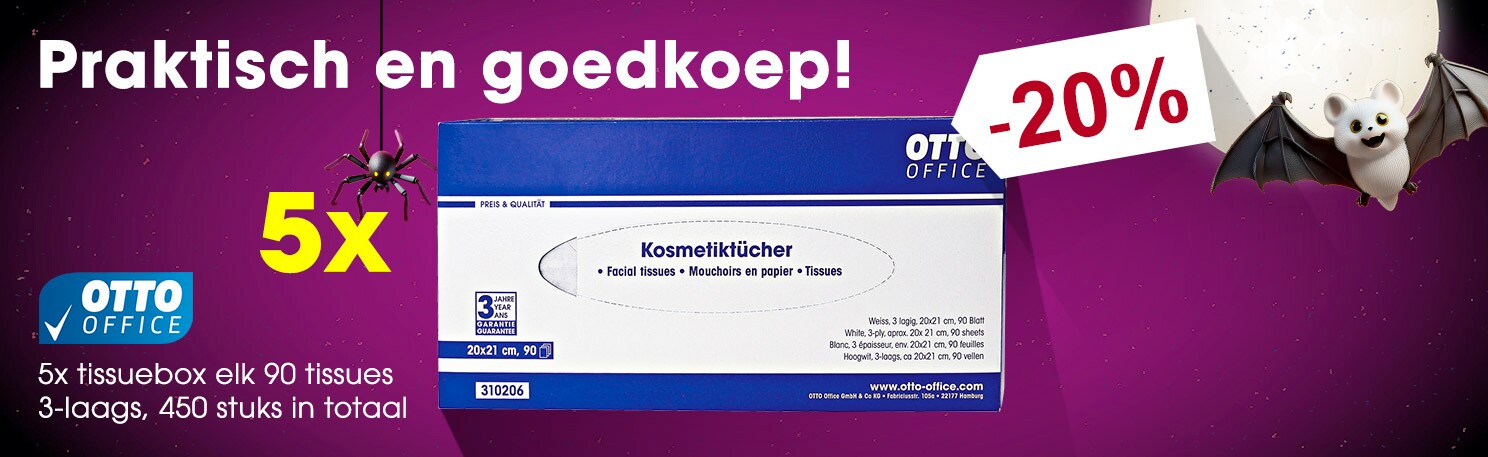 OTTO Office is dé leverancier bij uitstek voor al uw kantoorartikelen en -meubelen. In onze webshop vindt u meer dan 35000 kantoorartikelen aan zeer scherpe prijzen, die u zowel online, telefonisch als per fax kan bestellen. Bij ons kan u genieten van een gratis levering binnen de 24 uur, vanaf een netto bestelwaarde van €59, indien u bestelt voor 16 uur. Onze producten hebben minimaal 2 jaar garantie en u heeft 30 dagen de tijd om uw bestelling terug te sturen indien u niet tevreden bent. Al onze prijzen worden exclusief BTW vermeld.Om zo goed mogelijk op uw vraag in te spelen, biedt OTTO Office u een uitgebreid gamma kantoormeubelen aan. Beschikbaar in verschillende kleuren en materialen die volledig naar uw smaak gekozen en samengesteld kunnen worden. Daarnaast beschikken we over een breed assortiment stoelen: ergonomische bureaustoelen, bezoekersstoelen, bureaufauteuils, draaistoelen, ... Om onze brede waaier aan kantoormeubelen te vervolledigen kan u bij ons ook terecht voor kasten: ladenblokken, roldeurkasten, archiefkasten, dossierkasten, stalen kasten, hangmappenkasten, garderobekasten,... in alle maten en gewichten.
